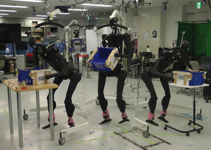 Loco-manipulation scenario with a H1 humanoid robot: picking a box up and droppping it off on another table.
